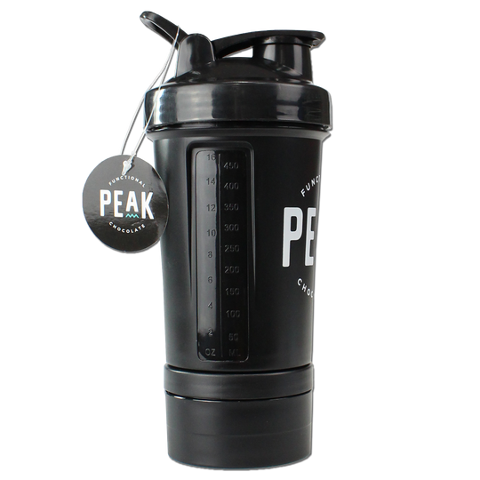 Lightweight and durable shaker with steel mixing ball and two extra compartments. The lower compartment perfectly fits your Peak while keeping it cool!
